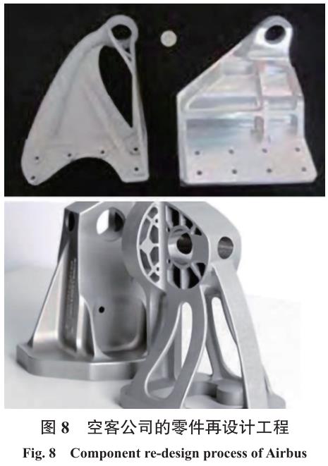 通用電氣公司專注于增材制造以降低其發動機制造成本,采用SLM技術已完成大量零部件的批量制造。圖7為航空發動機燃油噴嘴,將20個零件集成為1個部件進行打印,減重25%,已實現數萬個部件的批量制造。此外,空客通過基于有限元分析的結構優化應用于現有零部件的再設計,采用SLM技術實現了大幅減重,如圖8所示。