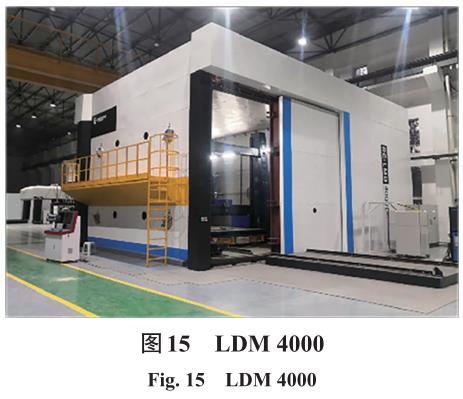 在 LMD 設備制造領域,以美國 EFESTO、德國EOS、西安鉑力特、南京中科煜宸、鑫精合激光等為代表的多家企業均已研發出工業級 LMD 設備,國內外典型LMD設備主要參數如表3所示。南京中科煜宸研發的大型智能化雙光束裝備性能指標達到國際先進、國內領先的水平,如圖 15所示,是國際上首次提出采用雙萬瓦級激光同步送粉打印技術,沉積速度可達 700 cm3/h,設備剛性成型尺寸可達4 m×3.5 m×3 m,柔性成型尺寸達13 m×3.5 m×3 m,加工能力覆蓋了目前航空鈦合金主承力結構件的所有門類,滿足未來型號及特殊構件制造需求。此外,航空工業成飛集團也研制了大型LMD同軸送粉設備,并實現了飛機增材制造工程化應用。降低設備加工使用成本將是LMD設備未來的研究方向。大型構件的應力控制和變形開裂是LMD技術面臨的關鍵難題。